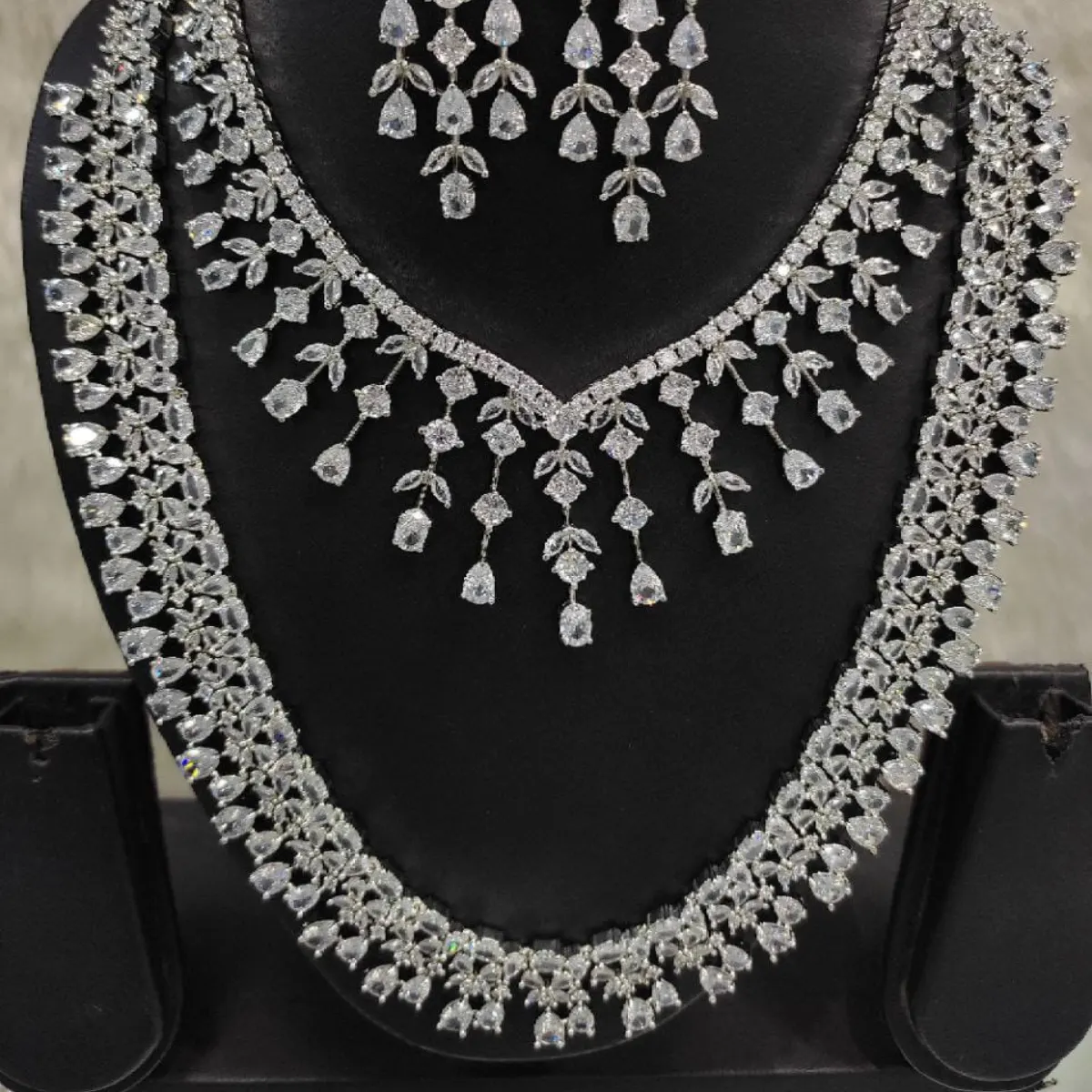 A beautifully crafted necklace set featuring shimmering crystal leaf and drop motifs for a graceful, flowing look. Paired with matching chandelier earrings, ideal for weddings, receptions, and grand festive occasions.